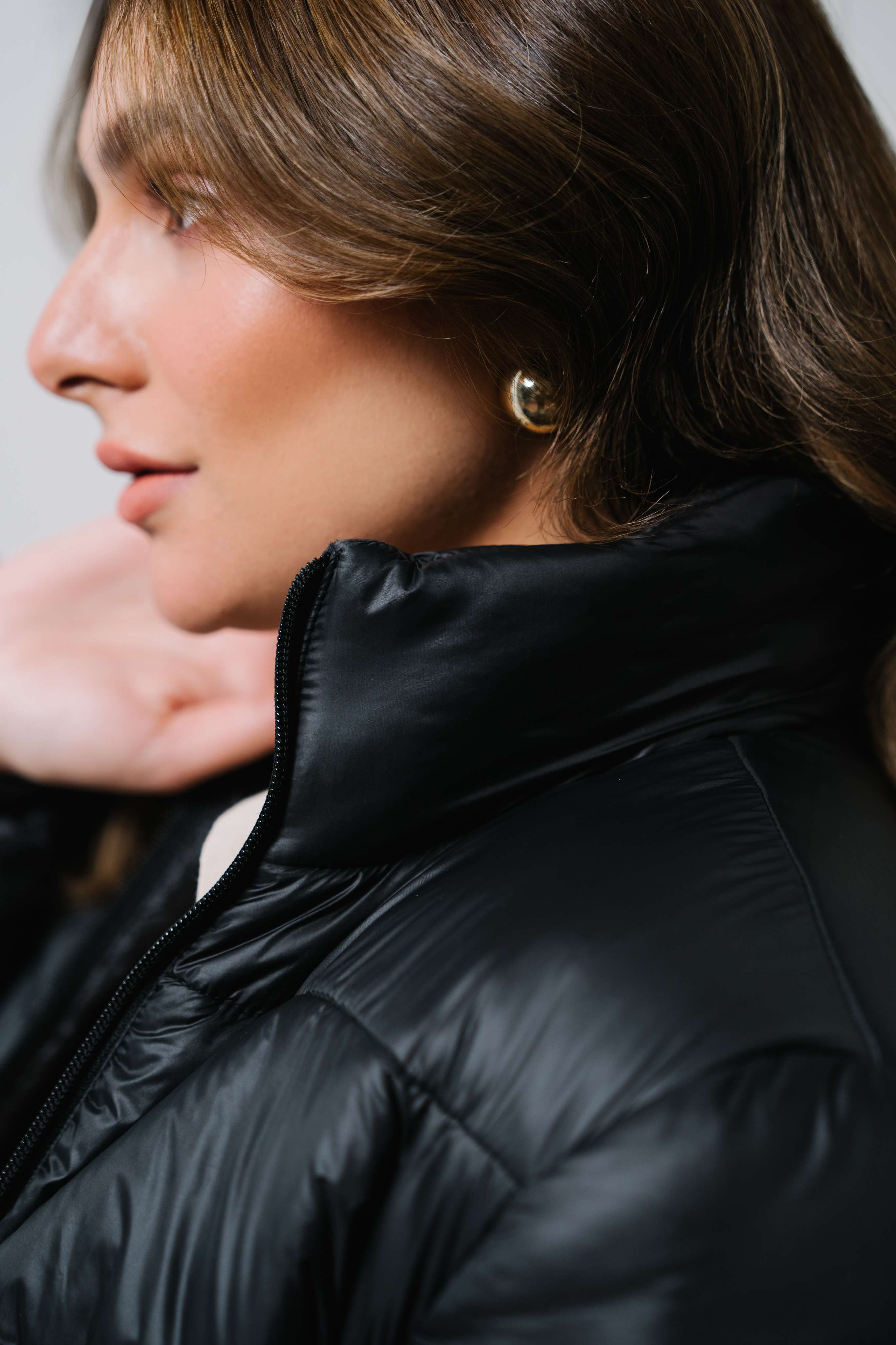 This modern women's black puffer jacket combines practicality with premium, lightweight insulation, Paired effortlessly with a statement scarf or bold accessories, this jacket is versatile enough for both casual outings and urban chic ensembles.